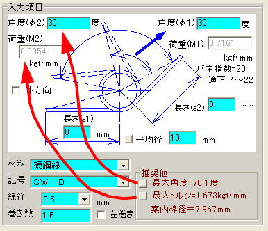 ・ばねの諸元を入力すると選択した材料の許容応力値内の使用条件になる値を表示します。