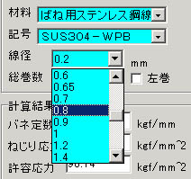 ・材料、材料記号を選択すると、その材料で選択できる線径がプルダウンリストにあるので、その中から選択する。