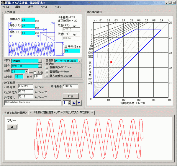 | 08/11/03 | v3.0:バネの形状表示にフリーと圧縮状態の切り替えボタンを追加、密着の余裕度や密状態を目視で確認、 使用状態の妥当性も判断材料として提供できるようにした(現在ベクターにバージョンアップ依頼中) |