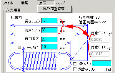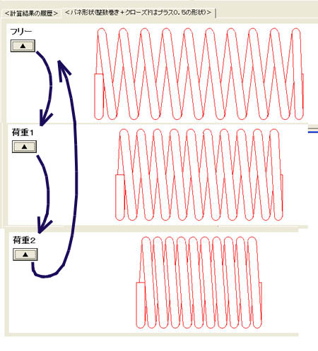 ・圧縮と引っ張りはバネ形状を表示させる画面に切り替えボタンでフリーと荷重1、荷重2の形状を交互に表示できる。