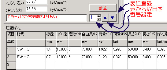 ・▼ボタンを押すと、表の設定番号の所に計算結果がコピーされる。